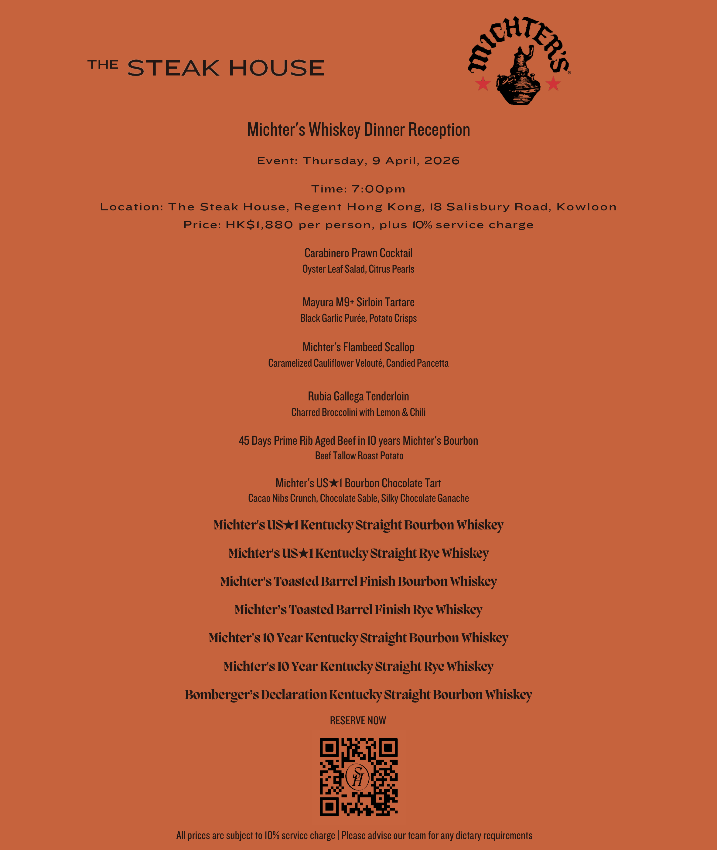 Join us at The Regent Steak House for an exclusive evening featuring Michter’s — America’s historic, handcrafted whiskey. Renowned for its meticulous small-batch production and rich, balanced flavors, Michter’s marries toasted oak, warm caramel, vanilla, and subtle spice for a smooth, memorable finish. Perfectly paired with signature dishes including Prime Rib aged with Michter’s 10 year Bourbon by Head Chef Amine Errkhis.